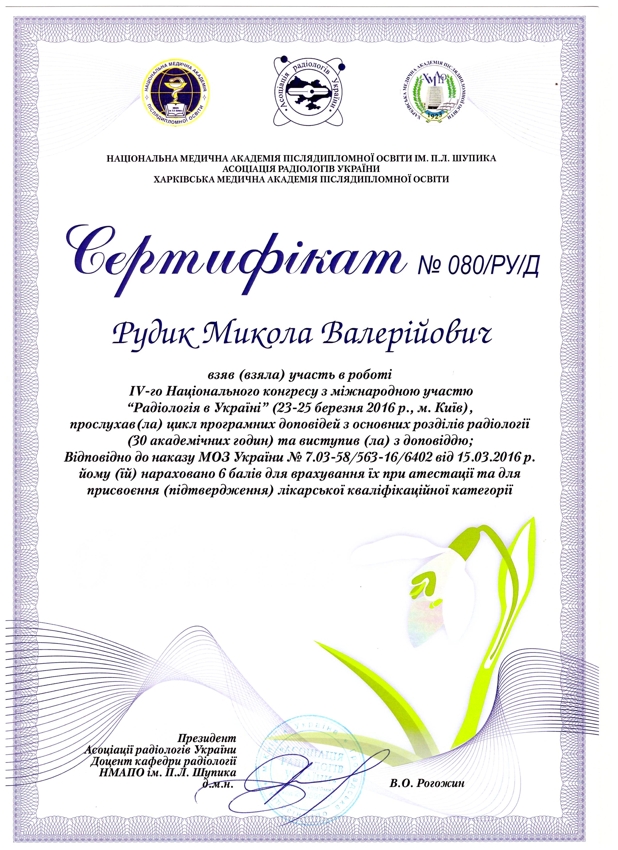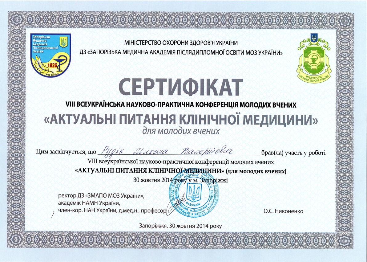 - Інтернатура у Запорізькій медичній академії післядипломної освіти за спеціальністю “Радіологія”, 2008 р.