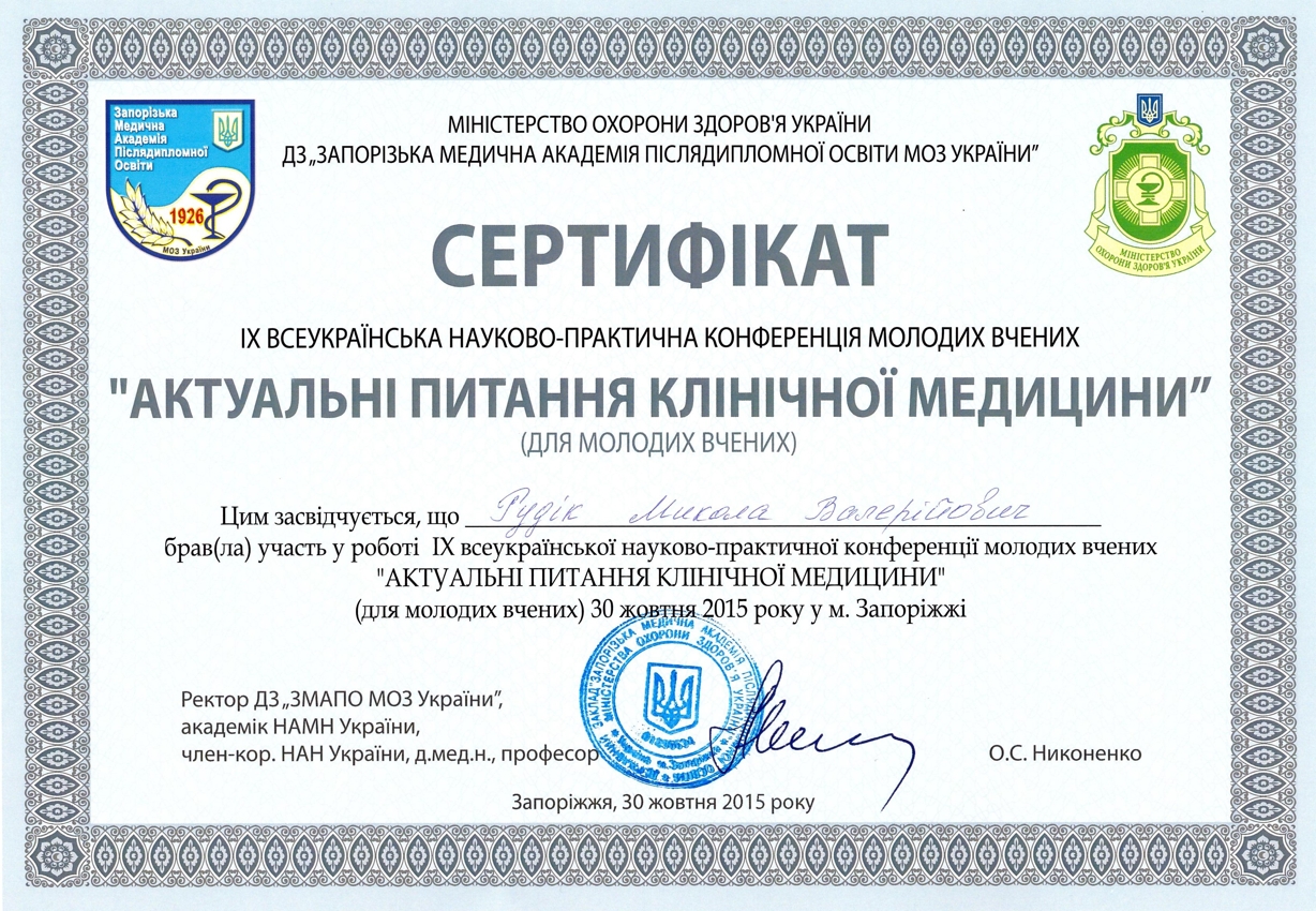 - Клінічна ординатура у Запорізькій медичній академії післядипломної освіти, 2013–2015 рр.