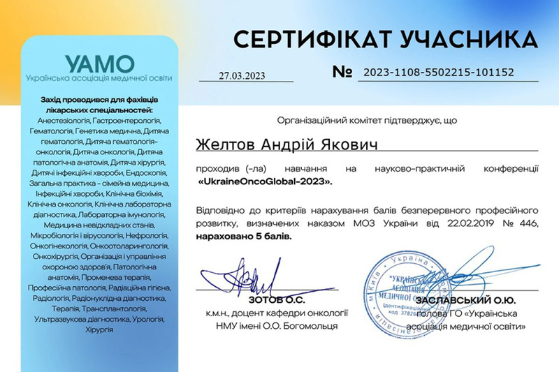 - Участь в науково-практичній конференції “Ukraine OncoGlobal 2023”, ГО “Українська Асоціація медичної освіти”, м.Київ, 2023р.