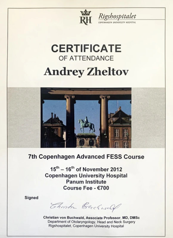 - Навчання на 7 Копенгагенському розширеному курсі FESS (Functional Endoscopic Sinus Surgery),м.Копенгаген, Данія, 2012р.