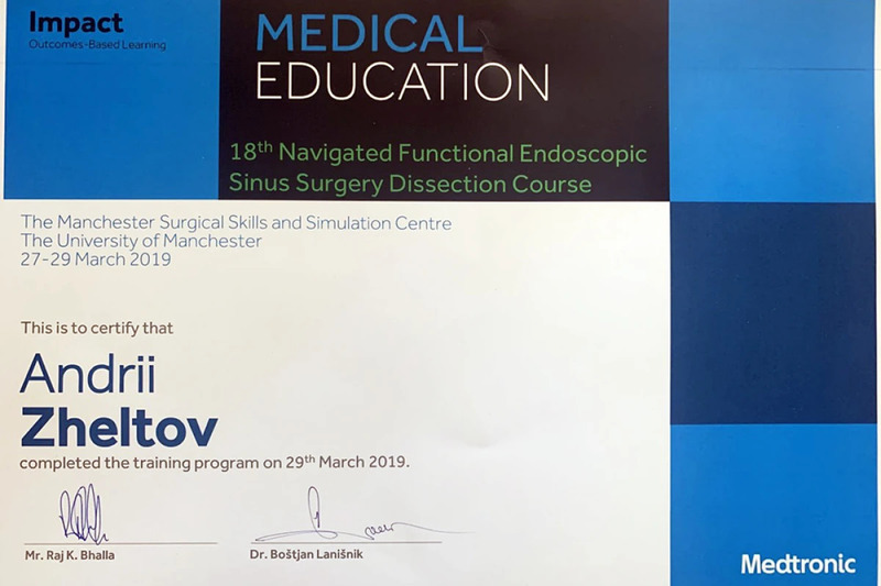 - Навчання на 18 курсі навігаційної функціональної ендоскопічної хірургії пазух носа з дисекції, Манчестерський університет, Велика Британія, 2019р.