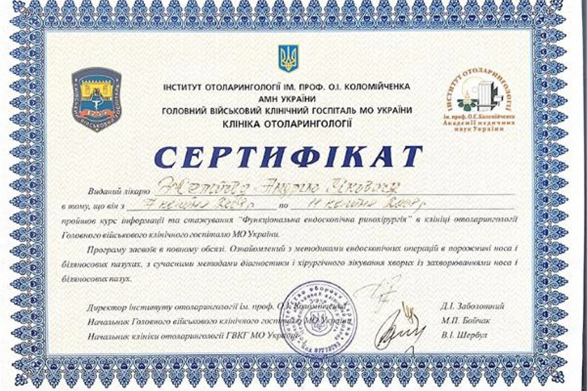 - Стажування “Функціональна ендоскопічна ринохірургія”, Клініка оториноларингології Головного військово-клінічного госпіталю МО України, м.Київ, 2008р.