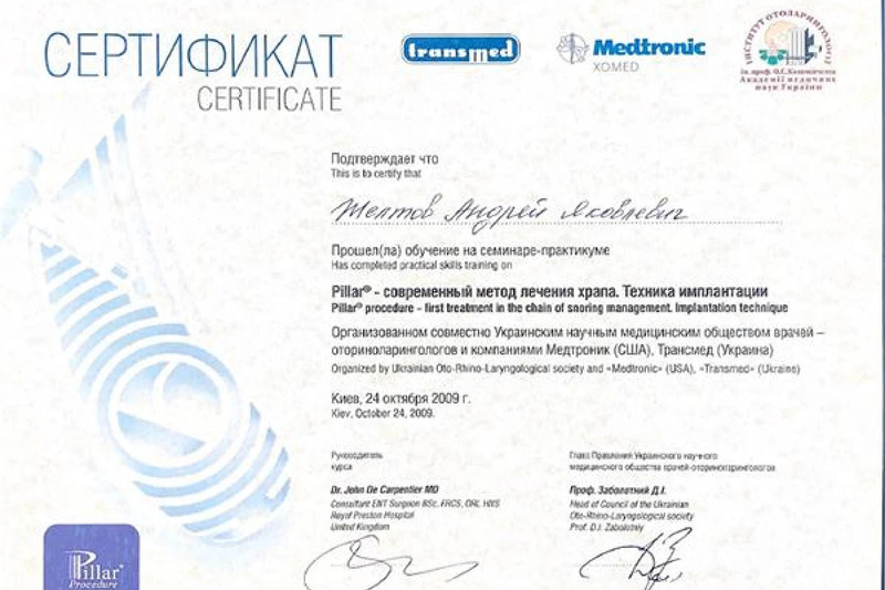 - Участь в семінарі-практикумі “Pillar - сучасний метод лікування хропіння. Техніка імплантації”, Українське наукове медичне товариство лікарів-оториноларингологів, “Медтронік” (США), “Трансмед” (Україна),м.Київ, 2009р.