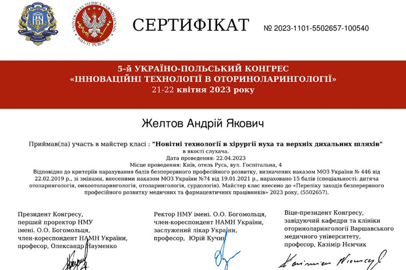 - Участь в майстер-класі “Інноваційні технології в хірургії вуха та верхніх дихальних шляхів”, 5 Українсько-Польський Конгрес “Інноваційні технології в оториноларингології”, м.Київ, 2023р.