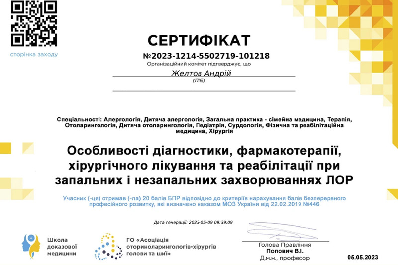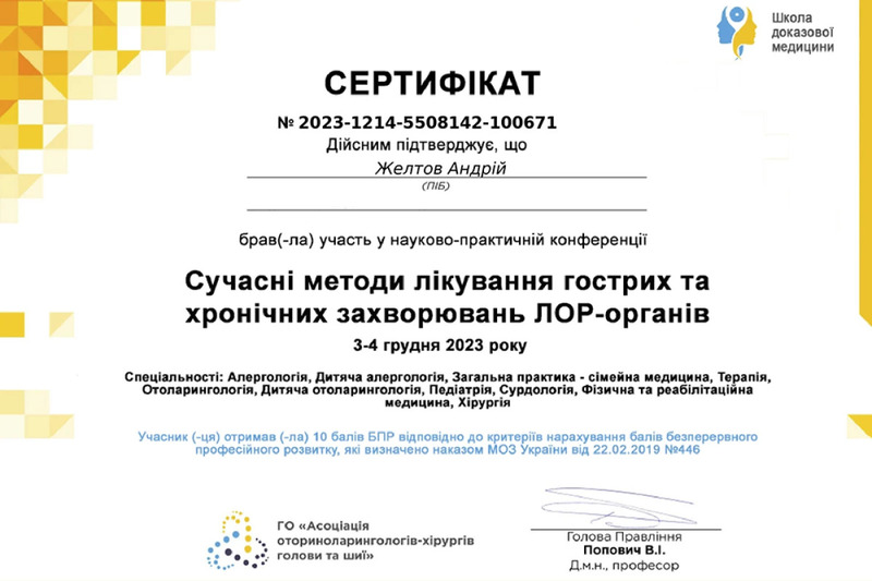 Лікар Желтов Андрій Якович спеціалізується на лікуванні захворювань вуха, горла і носа. Допомагає як дорослим, так і дітям в ситуаціях, коли потрібні глибока діагностика, повторне лікування або хірургічне втручання. Застосовує сучасні методи діагностики та лікування ЛОР-захворювань, в тому числі злоякісної природи. Працює зі складними випадками, які потребують індивідуального підходу, ендоскопії, малоінвазивної хірургії або корекції після неефективного лікування. Використовуючи в своїй щоденній практиці передове ендоскопічне та мікроскопічне обладнання, лазерні технології, коблацію та інші новітні засоби ефективної медичної допомоги, Андрій Якович проводить сучасні, малотравматичні операції з максимально коротким періодом відновлення пацієнта.