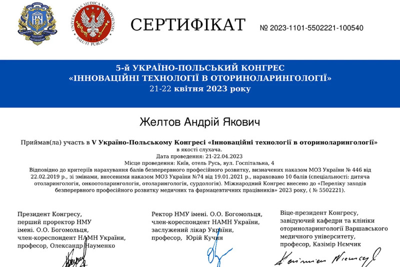 - Участь в 5 Українсько-Польському Конгресі “Інноваційні технології в оториноларингології”, м.Київ, 2023р.